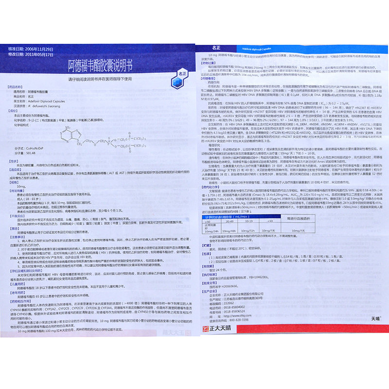 | 药品成份: | 主要成份为阿德福韦酯 | |