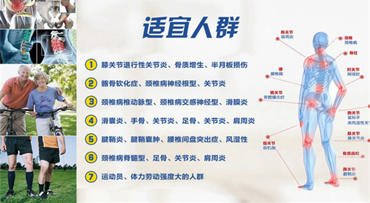 适应症: 用于治疗和预防全身所有部位的骨关节炎,包括膝关节、肩关节、髋关节、手腕关节、颈及脊椎关节和踝关节等。可缓解和消除骨关节炎的疼痛、肿胀等症状,改善关节活动功能。
