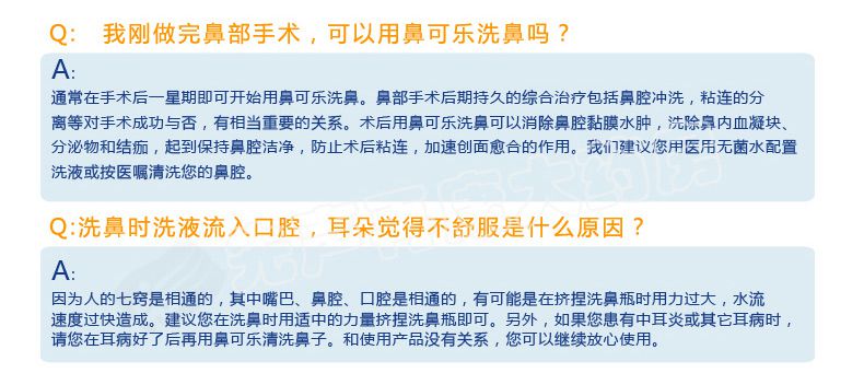 请仔细阅读说明书或在医务人员的指导下购买和使用。 【产品名称】 鼻可乐鼻腔清洗器 【规 格】 240ml+3.5g*10袋 (器+洗鼻剂10袋)【产品特点】 1.双正压反回流专利技术 2.不回流,不呛水 3.全面清洗鼻腔鼻窦 4.发明专利配方洗鼻剂 5.简单、安全、轻松、舒适 【适用范围】 1.用于鼻腔、鼻腔分泌物结痂清洗 2.萎缩性鼻炎药物清洗 3.鼻咽(癌)术后和化疗冲洗 4.清洗鼻部粘膜,避免因粘液在鼻腔的阻塞而导致感染,保护鼻腔粘膜 5.职业性吸入粉尘的鼻腔保健冲洗 【组 成】 1个洗鼻器 、10袋洗鼻剂 【使用方法】 1.加洁净的温水 2.加入洗鼻剂,水平移动摇匀 3.洗鼻 【批准文号】苏食药监械(准)字2011第2641167号 【生产厂家】 江苏泰德医药有限公司 |